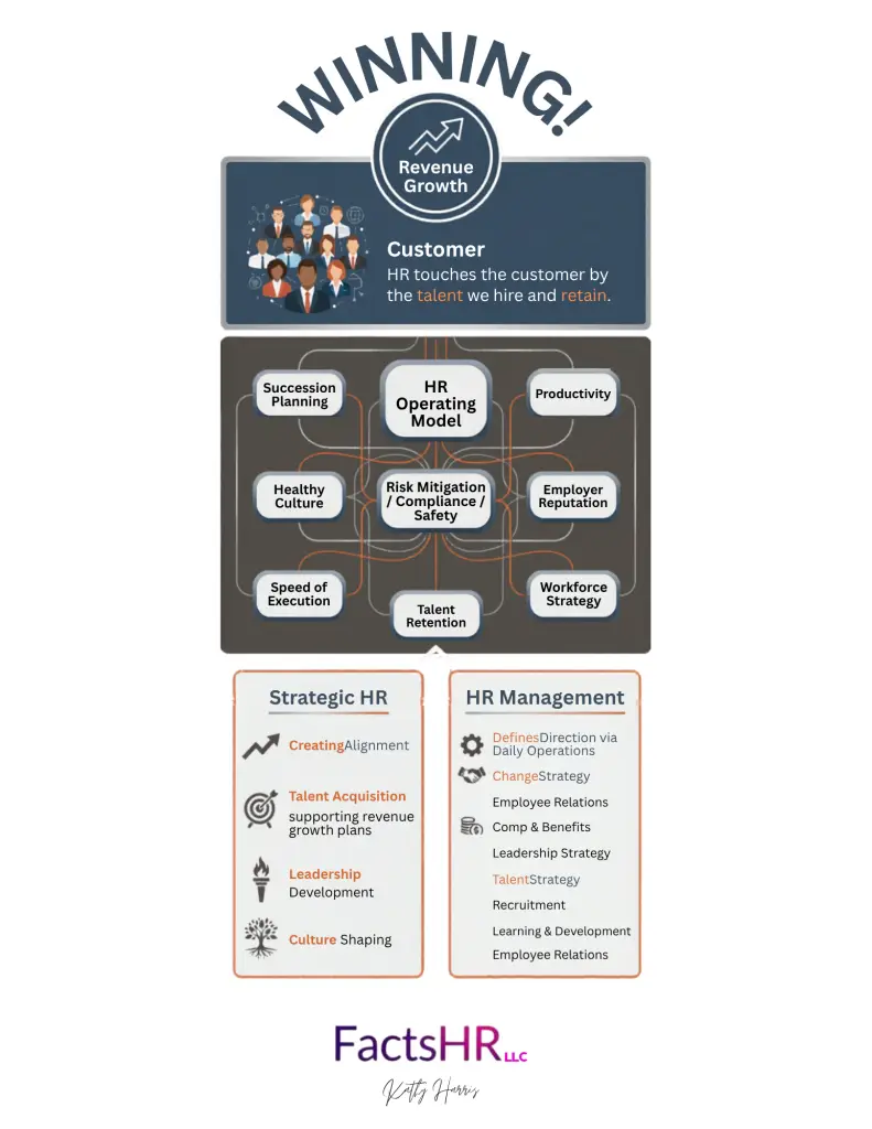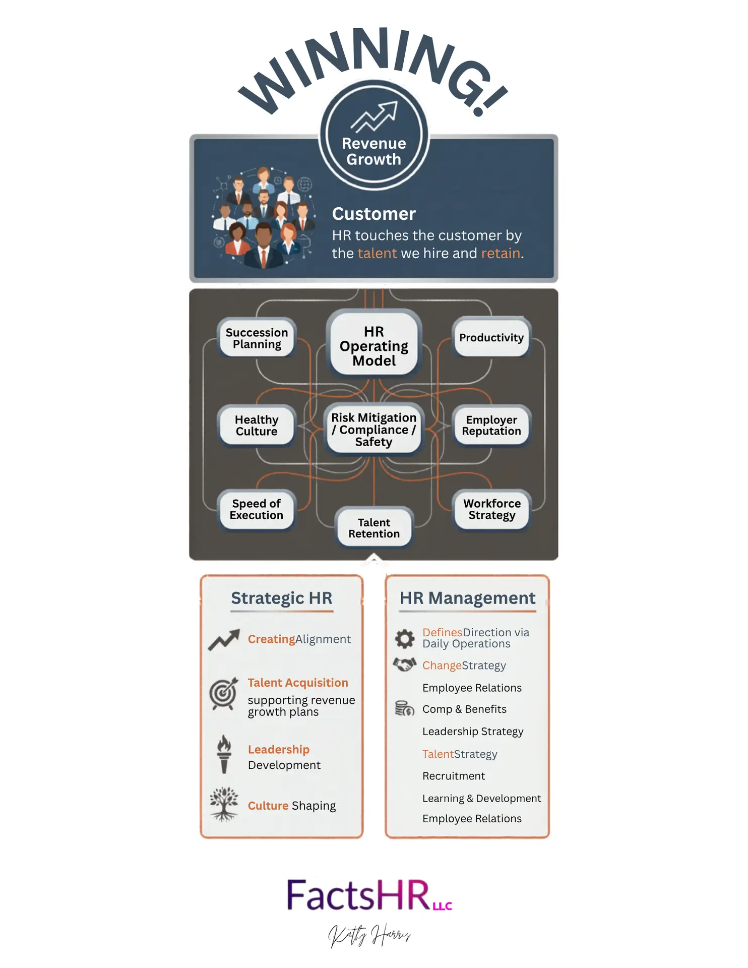 Keep it simple. When HR works well, it affects revenue, expenses, and customer outcomes. It’s about profitability and operations. Think of HR as the bridge between a company’s capabilities and how customers experience your product or service — with revenue growth sitting at the top of that chain. Hire and keep the right people. Miss that, and no amount of sales hustle will fix it.